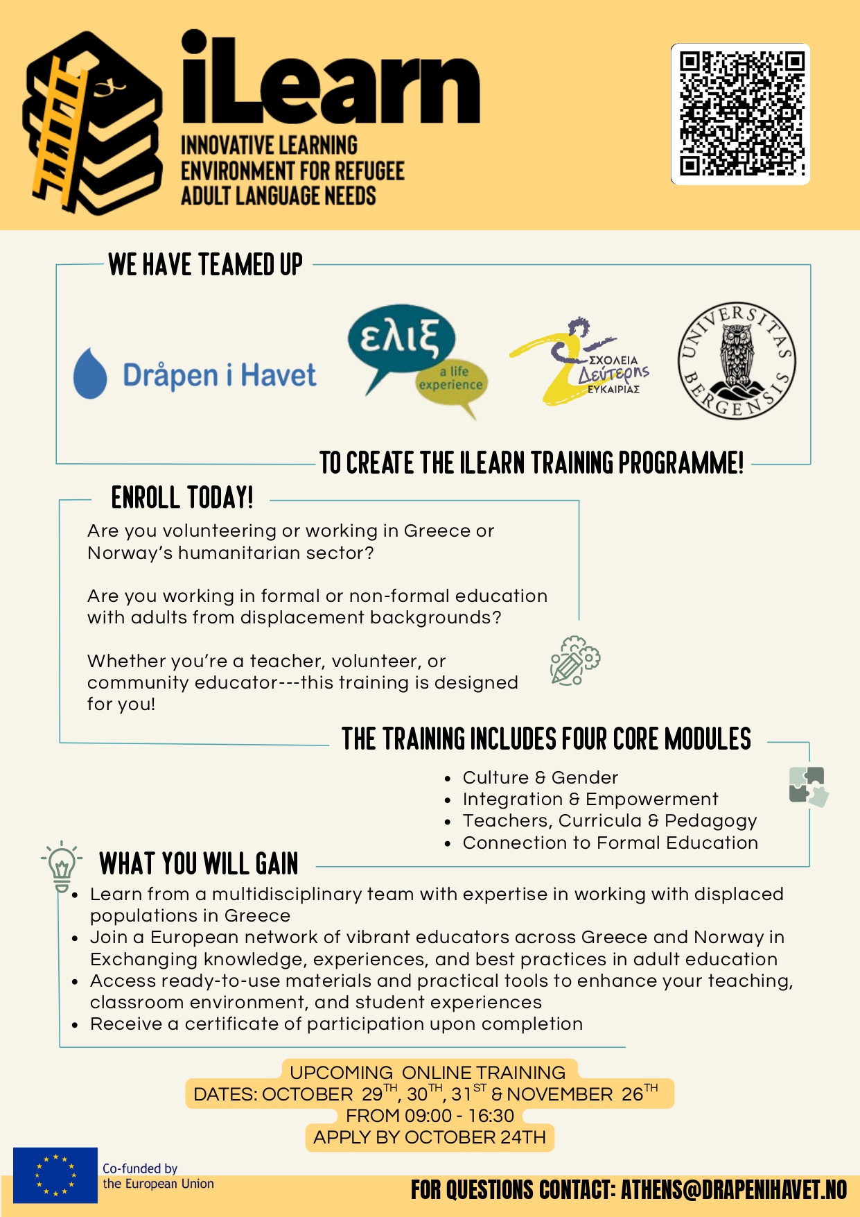 Στις 29, 30, 31 Οκτωβρίου και 26 Νοεμβρίου 2025 θα έχετε την ευκαιρία να συμμετέχετε στο διαδικτυακό εκπαιδευτικό μας πρόγραμμα ILEARN! Η εκπαιδευτική μας ομάδα θα προσφέρει τέσσερις ολόκληρες ημέρες διαδικτυακών συνεδριών, ενώ την 4η και τελευταία μέρα (26 Νοέμβρη) θα συνδεθείτε με μαθητές και καθηγητές από τη Νορβηγία που εργάζονται επίσης με ενήλικες που μετακινούνται.