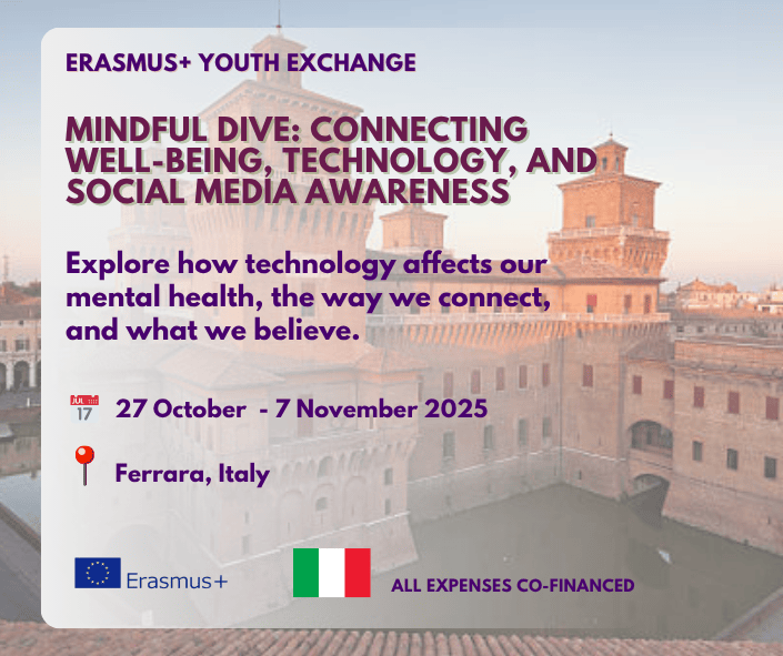 Η ΕΛΙΞ συμμετέχει ως εταίρος στο ευρωπαϊκό πρόγραμμα ανταλλαγής νέων “Mindful Dive: Connecting Well-being, Technology, and Social Media Awareness” το οποίο υλοποιείται στο πλαίσιο του Erasmus+ από τον οργανισμό IBO ITALIA. Το πρόγραμμα θα φέρει κοντά νέους ανθρώπους για να εξερευνήσουν πώς η τεχνολογία επηρεάζει την ψυχική μας υγεία, τον τρόπο που επικοινωνούμε και όσα πιστεύουμε.