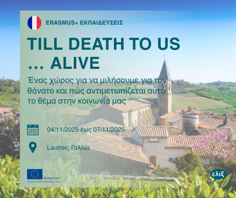 Η ΕΛΙΞ συμμετέχει ως εταίρος στο ευρωπαϊκό σεμινάριο κατάρτισης «Till death to us … alive», που υλοποιείται στο πλαίσιο του Erasmus+ από την οργάνωση La Petite Faucheuse στο Lautrec της Γαλλίας. Το πρόγραμμα θα προσφέρει έναν χώρο για να συζητήσουμε για τον θάνατο, τις κηδείες και το πένθος και πώς αυτοί οι θεματικοί άξονες αντιμετωπίζονται στην κοινωνία μας.