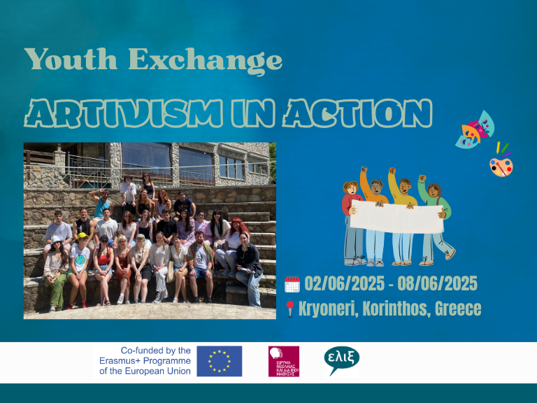 Η ΕΛΙΞ είχε τη χαρά να φιλοξενήσει την Ανταλλαγή Νέων Erasmus+ “Artivism in Action” στο Κρυονέρι Κορινθίας, από τις 2 έως τις 8 Ιουνίου 2025, με την υποστήριξη και συγχρηματοδότηση της Ευρωπαϊκής Επιτροπής μέσω του προγράμματος Erasmus+.
