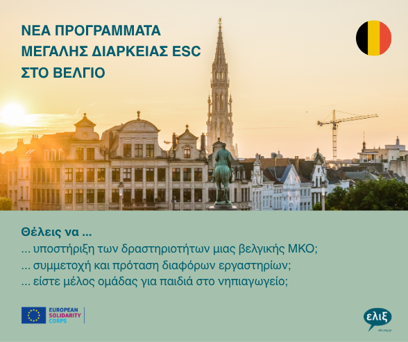 Μάθετε για νέα μακρoχρόνια προγράμματα αλληλεγγύης European Solidarity Corps (ESC): Εδώ μπορείτε να βρείτε τρεις ευκαιρίες για εθελοντικά προγράμματα στο Βέλγιο.