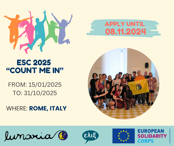 Ο οργανισμός Lunaria, συνεργάτης της ΕΛΙΞ, ανοίγει 2 θέσεις εθελοντών στο πρόγραμμα του European Solidarity Corps “Count Me In!”. Μην χάνεις χρόνο – κάνε αίτηση τώρα!