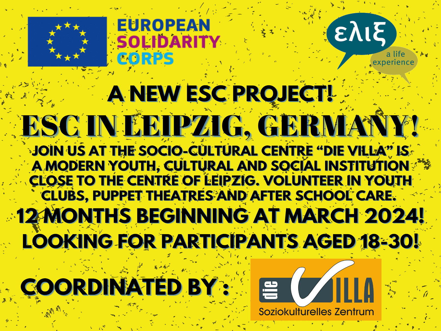 Μέσω της ΕΛΙΞ μπορείς τώρα και εσύ να δηλώσεις συμμετοχή σε σειρά εθελοντικών δράσεων, στο κέντρο "Die VILLA" της Λειψίας! Το κοινωνικό-πολιτιστικό κέντρο "Die VILLA" αποτελεί έναν σύγχρονο νεανικό και κοινωνικό θεσμό, στο κέντρο της Λειψίας. Η Οργάνωση Villa δραστηριοποιείται στον τομέα της ευρωπαϊκής εθελοντικής εργασίας από το 2001, συντονίζοντας μεταξύ άλλων πολλαπλά projects του European Solidarity Corps.