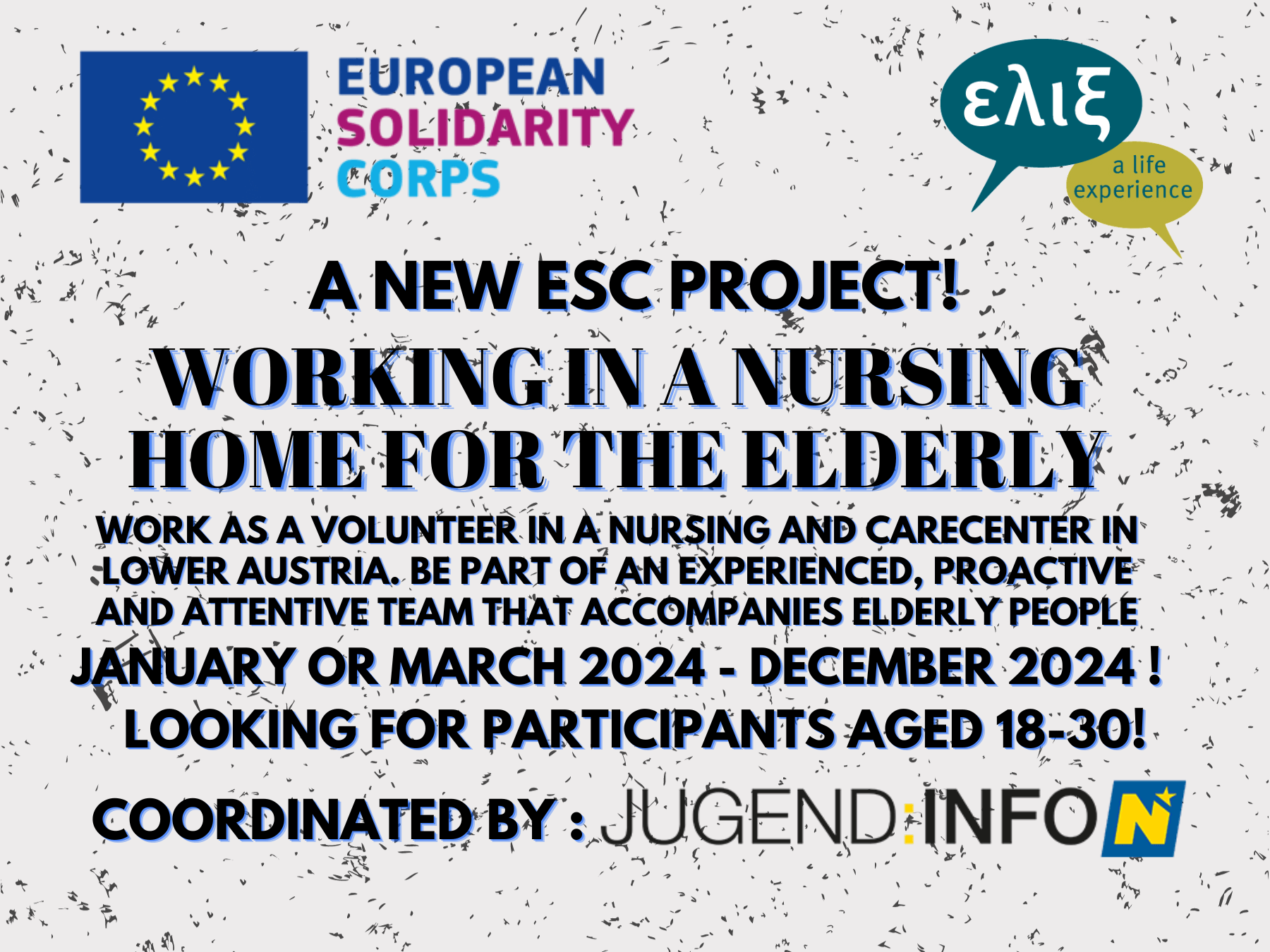 Μέσω της ΕΛΙΞ μπορείς τώρα να δηλώσεις συμμετοχή για ένα πολύ ενδιαφέρον πρόγραμμα του ESC με το όνομα "Working in a nursing home for the elderly", στο πανέμορφο Berndorf της Αυστρίας, μία ώρα έξω από τη Βιέννη. Το πρόγραμμα διοργανώνει η τοπική οργάνωση JUGEND:INFO και μέσω αυτού, μπορείτε να προσφέρετε και εσείς σε ανθρώπους που το έχουν πραγματικά ανάγκη.