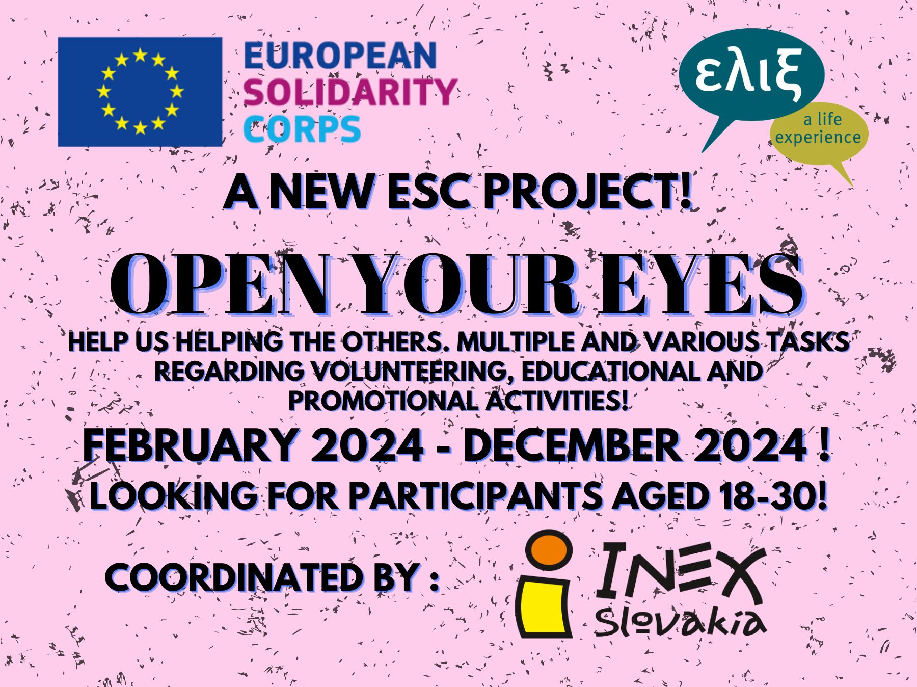 Μέσω της ΕΛΙΞ μπορείς τώρα να δηλώσεις συμμετοχή για ένα πολύ ενδιαφέρον πρόγραμμα του ESC με το όνομα "OPEN YOUR EYES", στην πανέμορφη Μπρατισλάβα, το οποίο διοργανώνει η τοπική οργάνωση INEX Slovakia! Η INEX προσκαλεί τους νέους εθελοντές στο να τη βοηθήσουν σε εκπαιδευτικές και άλλες δραστηριότητες, μέσα από την ταυτόχρονη εκμάθηση νέων δεξιοτήτων.