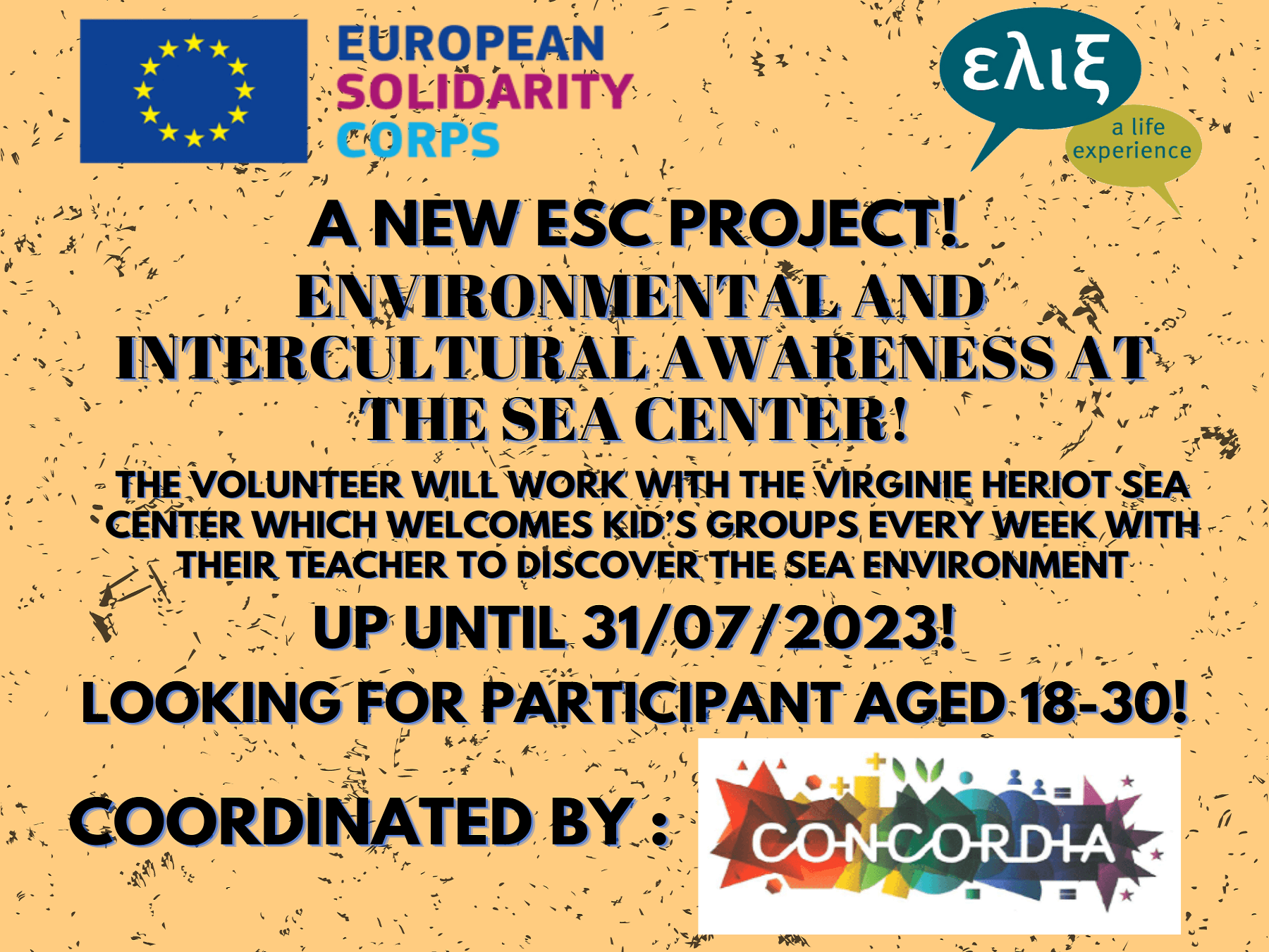 Μέσω της ΕΛΙΞ μπορείς τώρα να δηλώσεις συμμετοχή για ένα πολύ ενδιαφέρον πρόγραμμα του ESC με το όνομα "Περιβαλλοντική και διαπολιτισμική ευαισθητοποίηση στο Sea Center (Environmental and intercultural awareness at the Sea Center)”, το οποίο βρίσκεται στην κοινότητα του Cancale, στη θάλασσα της Μάγχης! Υπεύθυνη για το project είναι η Γαλλική οργάνωση "Concordia".