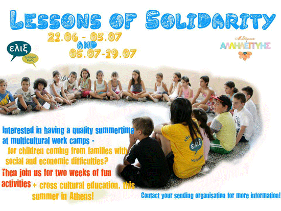 ELIX is organizing two workcamps in 2014 under the framework of -Lessons of Solidarity- Project which aims to proactively support Greek Institutions in Attica, hosting and caring for children with social problems and mental and physical disabilities. The LESSONS OF SOLIDARITY Project is part of a three year initiative funded by the Stavros Niarchos Foundation (www.SNF.org) in order to assist the increasing needs such Institutions are facing in view of the socioeconomic crisis in Greece.