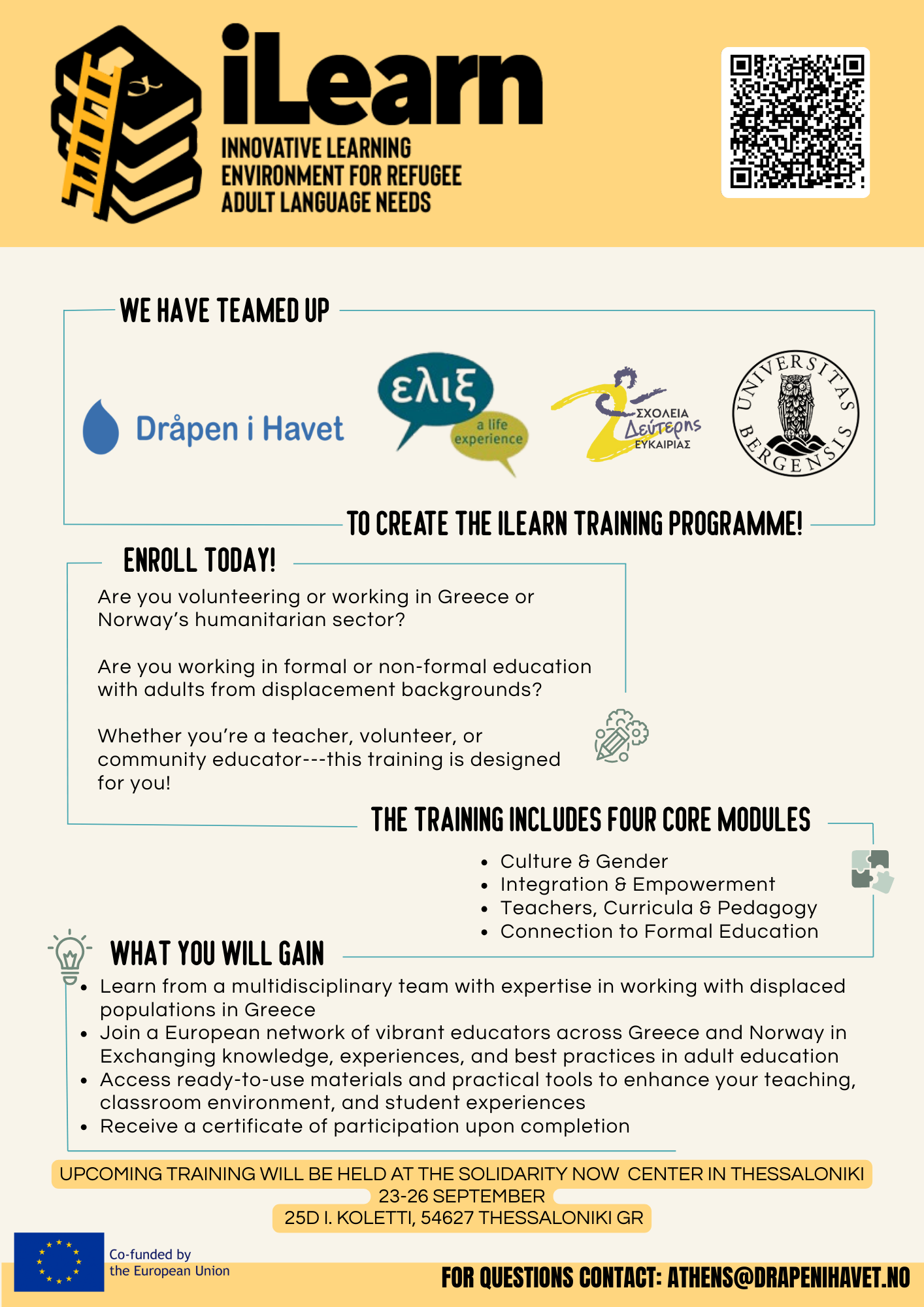 Dråpen i Havet is collaborating with ELIX, the University of Bergen, and Second Chance School Kalamata to develop training modules and approaches tailored for educators and organizations working in adult refugee education. The goal of ILEARN is to enhance the quality of education, both internally and externally, by implementing modern methods and approaches. The project is supported through the ERASMUS+ Small-Scale Partnerships program.