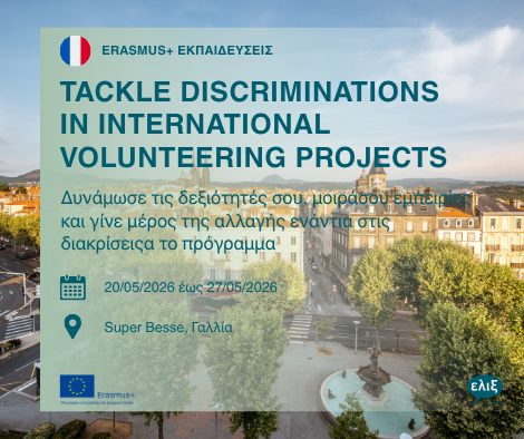 Η ΕΛΙΞ συμμετέχει ως εταίρος στο ευρωπαϊκό εκπαιδευτικό πρόγραμμα “Tackle Discriminations in International Volunteering Projects”, το οποίο υλοποιείται στο πλαίσιο του Erasmus+ από τον οργανισμό Concordia στο Super Besse, Γαλλία.