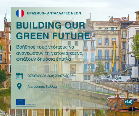 Η ΕΛΙΞ συμμετέχει ως εταίρος στην ευρωπαϊκή ανταλλαγή νέων «Building Our Green Future», που υλοποιείται στο πλαίσιο του Erasmus+ από τον οργανισμό Compagnons Bâtisseurs Occitanie στη Narbonne, Γαλλία. Κύριος στόχος του προγράμματος είναι η συμμετοχή σε ένα διεθνές workcamp, όπου οι συμμετέχοντες θα συμβάλουν στην αναβάθμιση μιας γειτονιάς και στη δημιουργία επίπλων για κοινόχρηστους χώρους. Πρόκειται για μια πρωτοβουλία που συνδυάζει την αισθητική βελτίωση του δημόσιου χώρου με την ενίσχυση της κοινωνικής συνοχής.