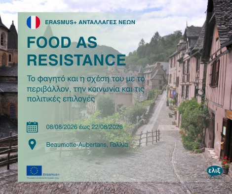 Η ΕΛΙΞ συμμετέχει ως εταίρος στο ευρωπαϊκό πρόγραμμα ανταλλαγής νέων «Food as Resistance», το οποίο υλοποιείται στο πλαίσιο του Erasmus+ από τον οργανισμό Solidarités Jeunesses στο Beaumotte-Aubertans, Γαλλία. Το πρόγραμμα θα φέρει κοντά νέους από τέσσερις διαφορετικές χώρες γύρω από ένα κεντρικό θέμα: το φαγητό και η σχέση του με το περιβάλλον, την κοινωνία και τις πολιτικές επιλογές.