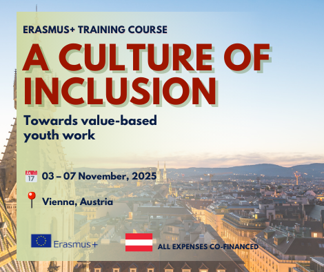 Η ΕΛΙΞ συμμετέχει ως εταίρος στο ευρωπαϊκό εκπαιδευτικό σεμινάριο “A Culture of Inclusion: Towards value-based youth work”, το οποίο υλοποιείται στο πλαίσιο του Erasmus+ από τον οργανισμό Grenzenlos στη Βιέννη, Αυστρία. Το πρόγραμμα θα φέρει κοντά εργαζόμενους στον τομέα της νεολαίας, εθελοντές/ντριε, στελέχη και εκπαιδευτές, δημιουργώντας χώρους διαλόγου γύρω από την ένταξη, την εργασία με τη νεολαία και τις αξίες, με έναν μετασχηματιστικό τρόπο.