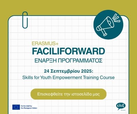 Από τις 24 έως τις 29 Σεπτεμβρίου 2025, η ΕΛΙΞ έχει τη χαρά να πραγματοποιήσει το εκπαιδευτικό σεμινάριο “FaciliForward: Δεξιότητες για την Ενδυνάμωση της Νεολαίας” στη Νέα Μάκρη, Αττικής.