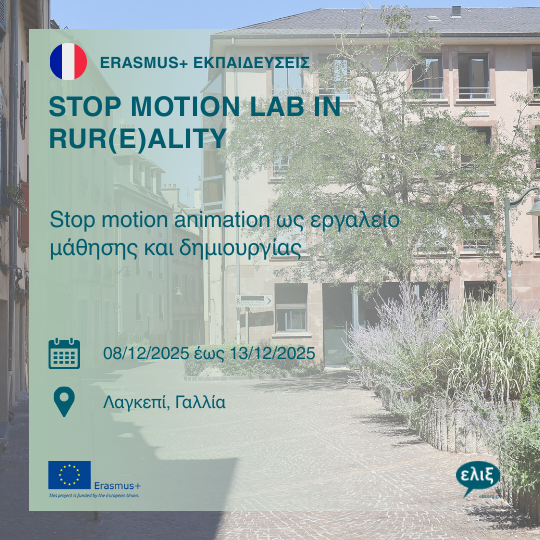 Η ΕΛΙΞ συμμετέχει ως εταίρος στο ευρωπαϊκό εκπαιδευτικό πρόγραμμα “Stop Motion Lab in Rur(e)ality”, το οποίο υλοποιείται στο πλαίσιο του Erasmus+ από τον οργανισμό Association Citrus στο Laguépie της Γαλλίας. Το πρόγραμμα θα φέρει κοντά άτομα που εργάζονται στον τομέα της νεολαίας και νέες/νέους ηγέτιδες/ηγέτες, που ενδιαφέρονται να εξερευνήσουν το stop motion animation ως ένα εκπαιδευτικό και δημιουργικό εργαλείο.